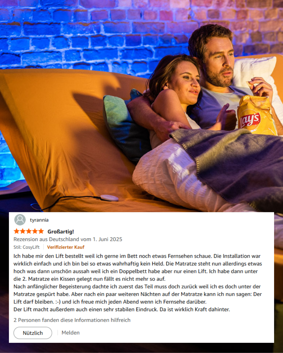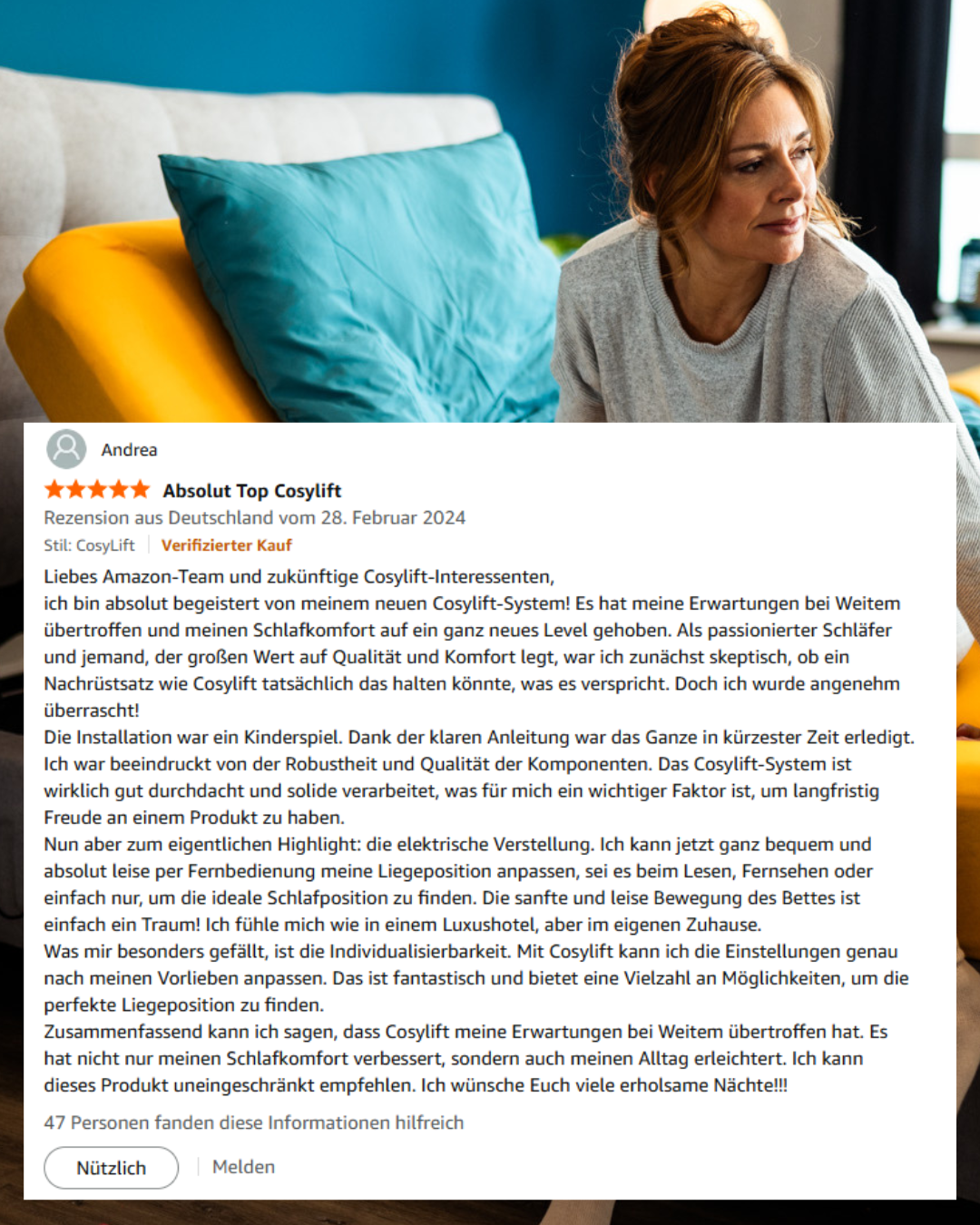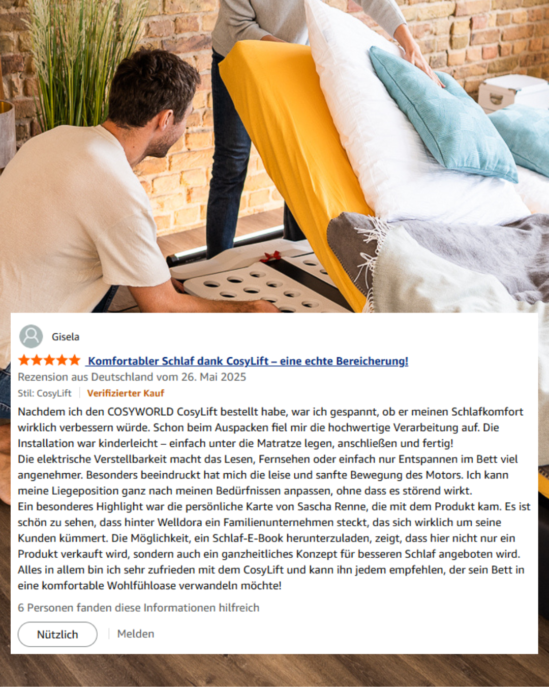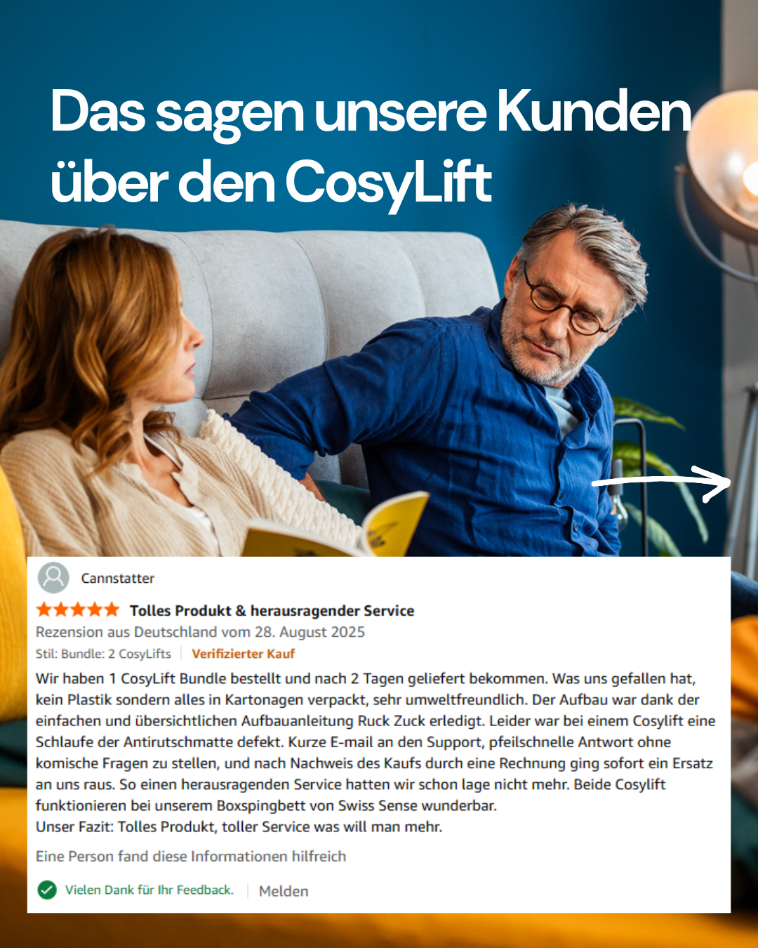 Unsere Kunden berichten, dass sie mit dem CosyLift eine angenehmere Schlafposition finden konnten – sowohl bei Sodbrennen aber auch bei anderen Beschwerden wie Rückenschmerzen oder einfach für mehr Komfort im Bett.